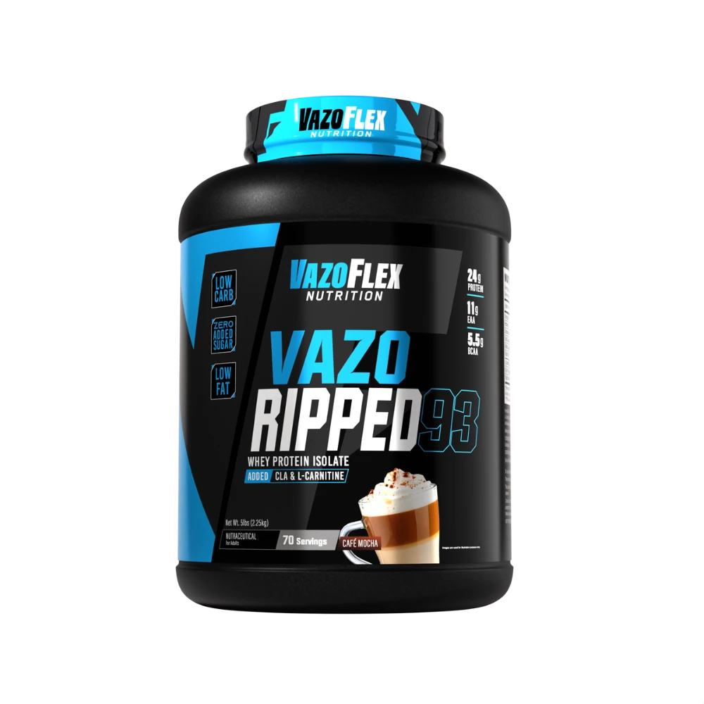 Vazo Ripped 93 is a premium whey protein isolate designed for serious athletes and fitness enthusiasts who want lean muscle, faster recovery, and enhanced fat metabolism. Each serving delivers 24g of pure protein, 11g of EAAs, and 5.5g of BCAAs, fortified with CLA and L-Carnitine to support muscle definition and energy utilization. With zero added sugar, low carbs, and low fat, it’s the perfect supplement for building a shredded physique without compromise.