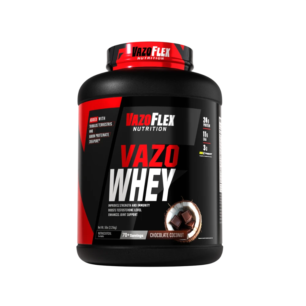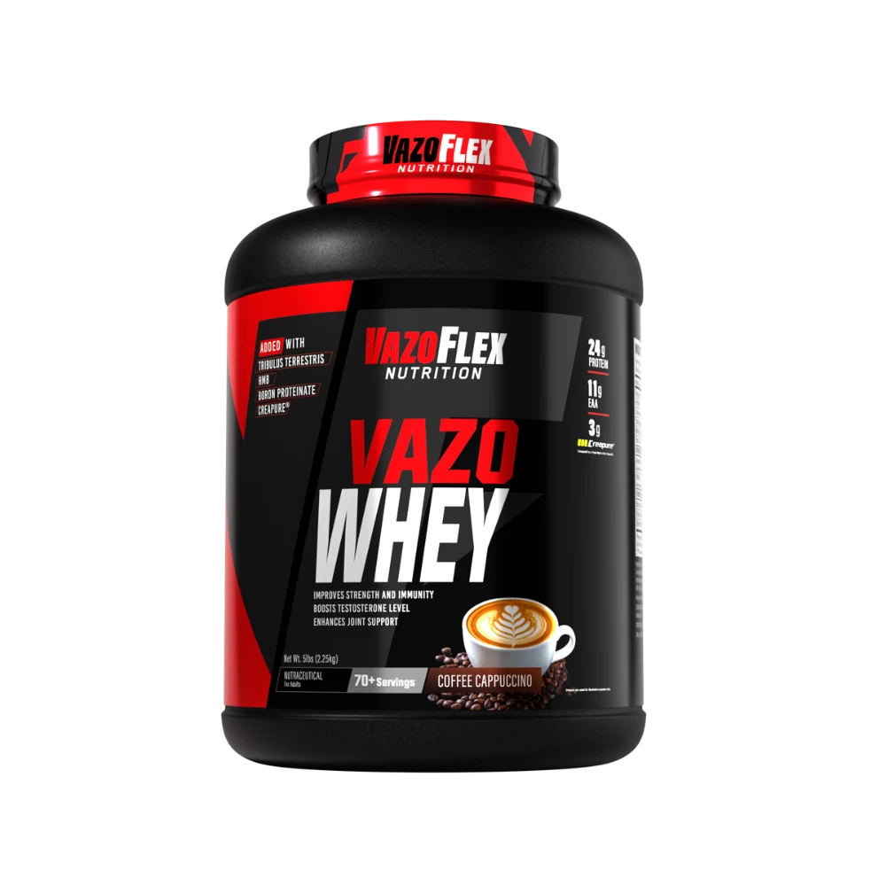 Vazo Whey is a scientifically designed whey protein blend that goes beyond muscle building. Each serving delivers 24g high-quality protein, 11g EAAs, and 3g Creatine Monohydrate for strength, recovery, and performance. What makes it unique is the addition of Tribulus Terrestris, Boron, and Digezyme® enzymes, supporting testosterone levels, immunity, and improved digestion.